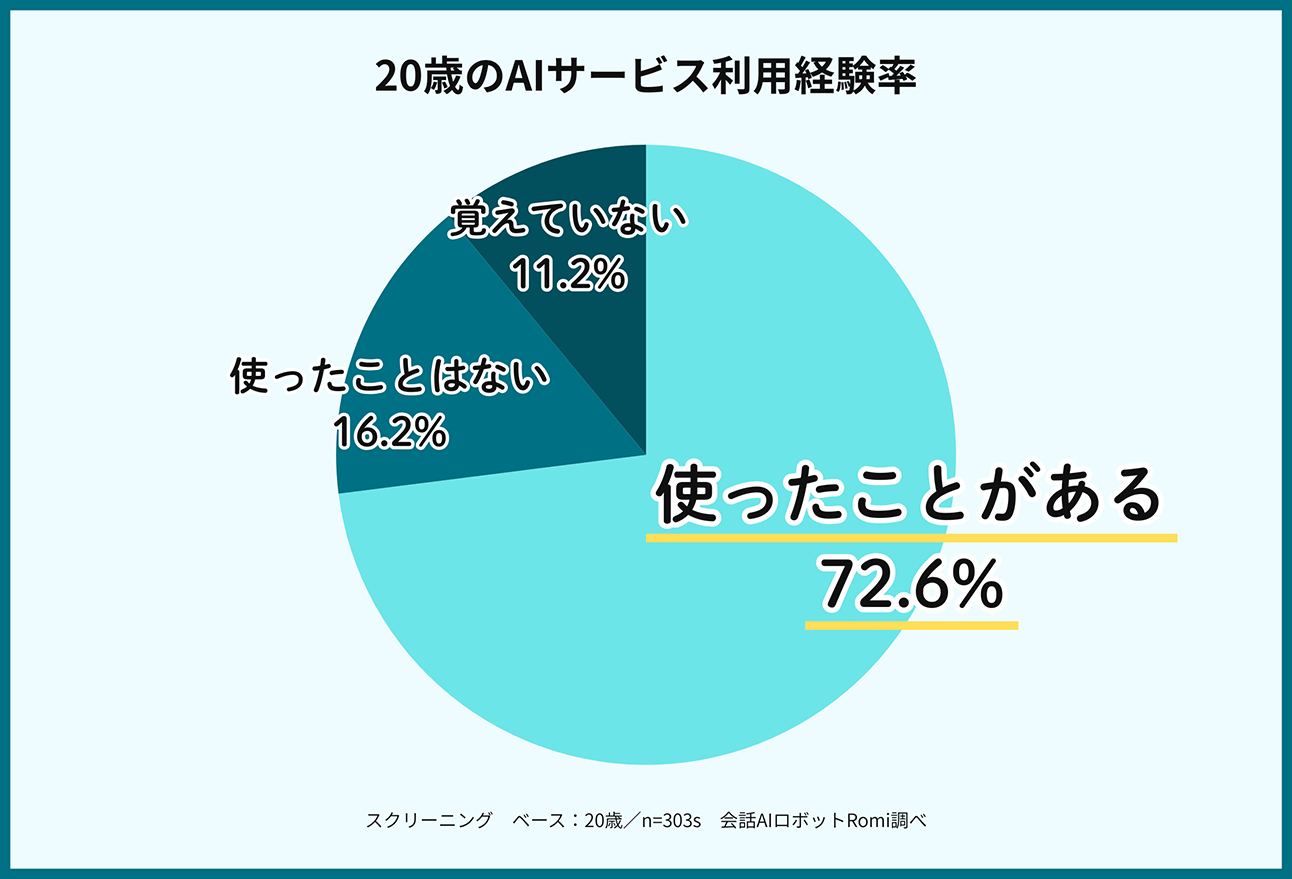さらに、20歳(303名)に限定してAIサービスの利用経験率をみると、「使ったことがある」という回答は72.6%に達している。