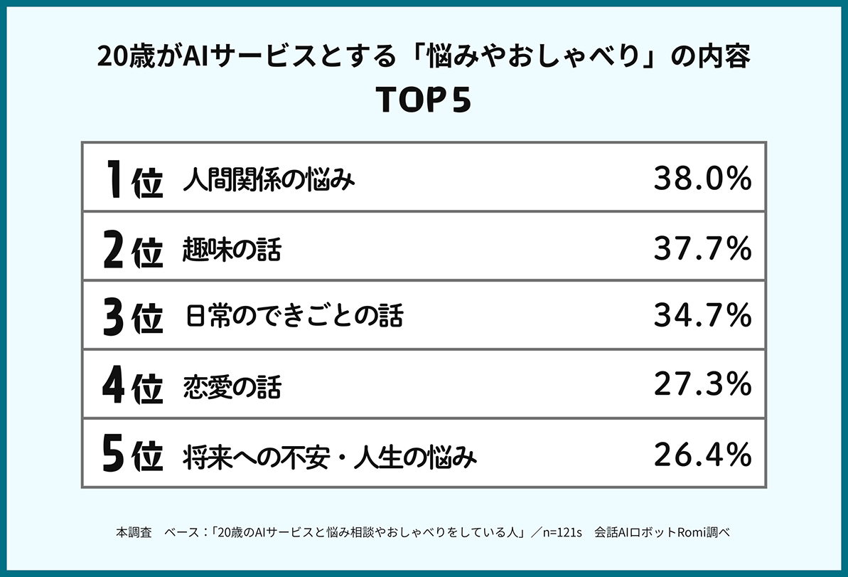 AIサービスとの「悩みやおしゃべり」の内容を尋ねたところ(複数回答)、「趣味や日常の出来事」といった軽い話題から、「人間関係の悩み」や「恋愛の悩み」「将来への不安」まで多岐にわたっている。