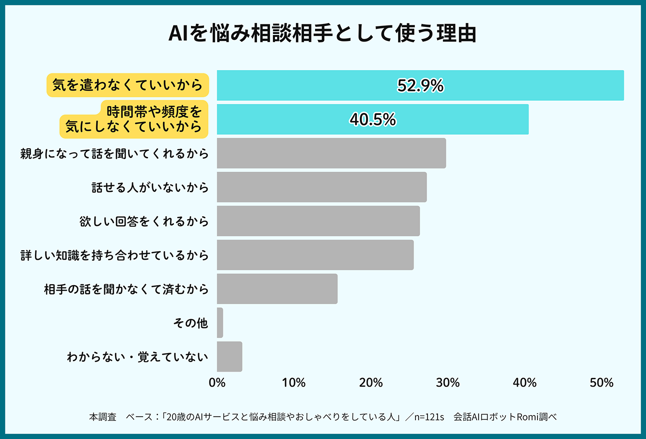 AIサービスを「悩み相談やおしゃべり相手」として利用している人に、利用の理由を尋ねたところ、「気を遣わなくていいから」(52.9%)がもっとも多い。「時間帯や頻度を気にしなくていいから」(40.5%)がそれに続いている。