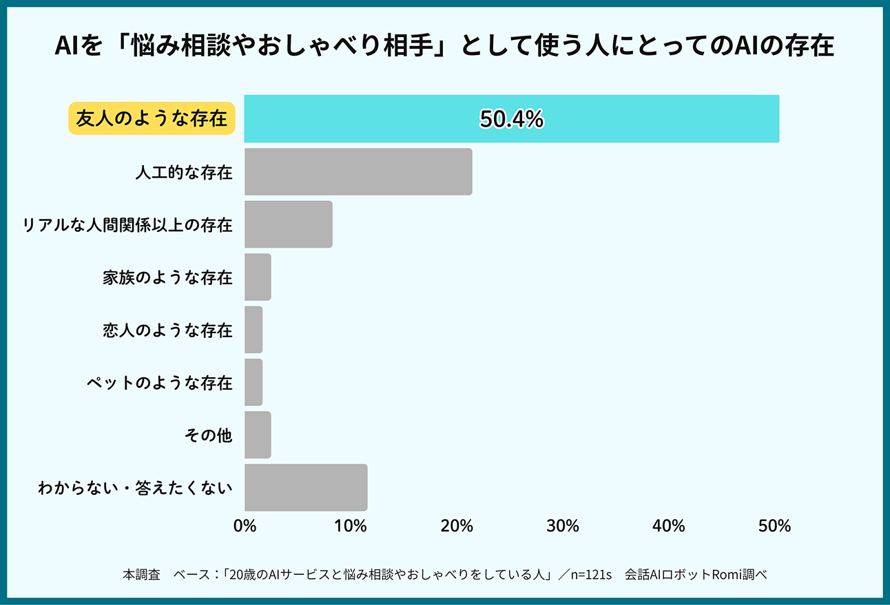 同じく、AIサービスを「悩み相談やおしゃべり相手」として利用している人に対し、AIをどのような存在だと感じているかという質問では、「友人・知人のような存在」という回答が50.4%でもっとも多い。また、「リアルな人間以上の存在」という回答も1割となっている。