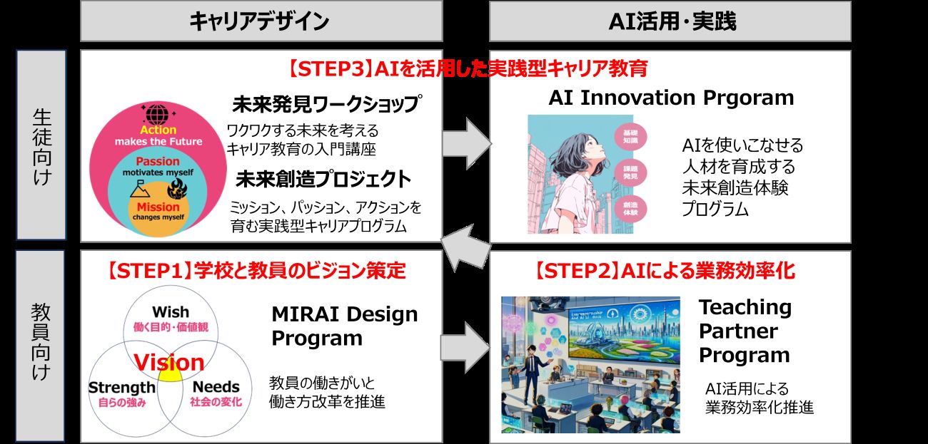 現在募集しているモニター校は、2026年度の本格導入を見据えたもので、費用は無料となっている。募集数は若干校(先着順)で、期間は契約締結後から2026年3月末まで。対象は全国の中学校、高等学校、高等専門学校で、部活動・同好会や有志プロジェクト単位での参加が可能。提供内容には、AIデジタル教材「MiraPASS」の生徒・教員アカウント発行や、月1回のオンライン合同ワークショップ参加権(起業家講師による指導)、教員向けコミュニティおよび運営サポートが含まれる。