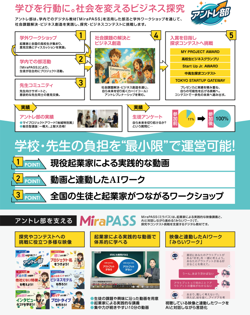 アントレ部は、動画教材とAIワークを活用した学習システム「MiraPASS(ミラパス)」と、現役起業家によるオンライン指導を組み合わせたプログラム。2022年度からの「総合的な探究の時間」必修化に伴う教員の負担軽減と、生徒の主体的な探究学習およびビジネス創出支援の両立を目的としている。