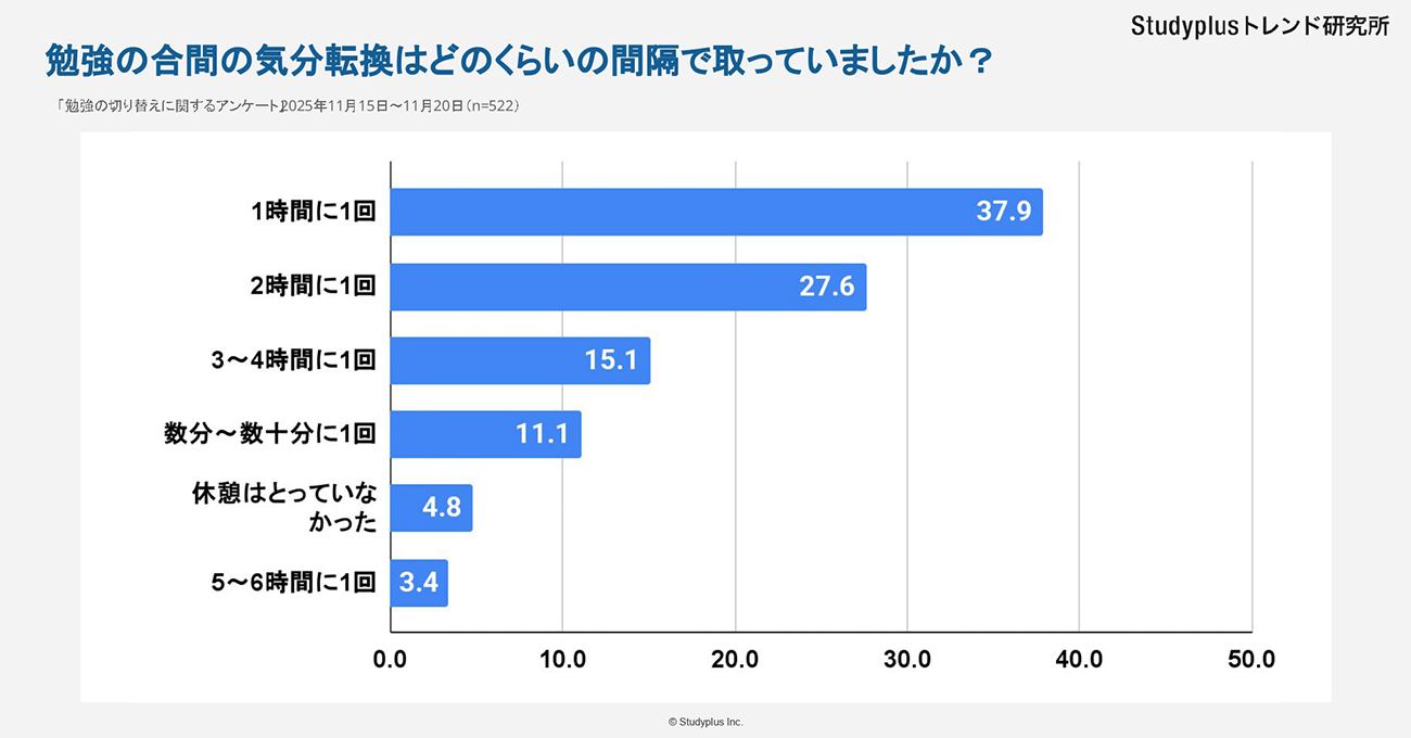 調査対象者に、勉強の合間の休憩時間の間隔を尋ねたところ、「1時間に1回」(37.9%)がもっとも多い。次いで「2時間に1回」(27.6%)となっている。