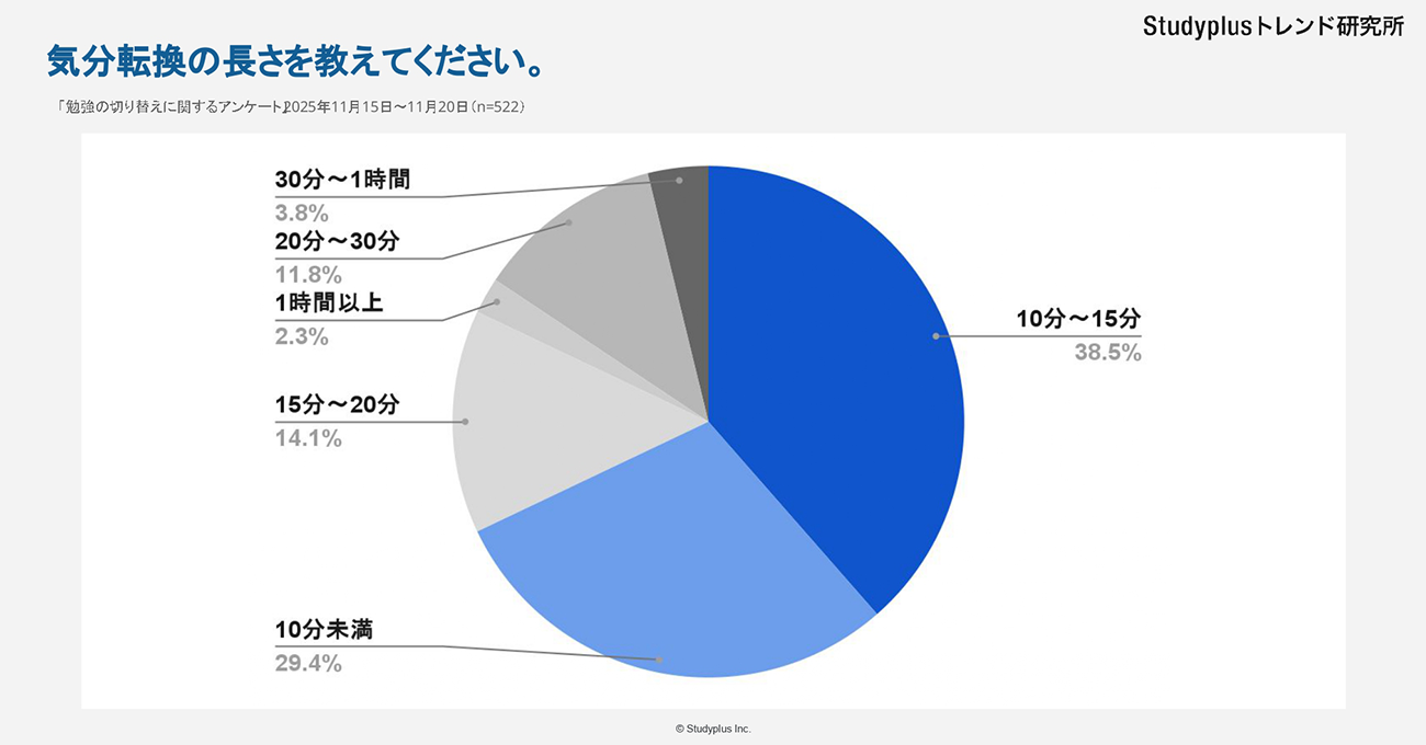 スタディプラスは、同社の運営するStudyplusトレンド研究所が、学習管理アプリ「Studyplus」上で全国の大学生を対象に実施した、「勉強の切り替えに関するアンケート」の結果を1月9日に発表した。同調査は、2025年11月15日〜20日の期間に行われ、522名(1年生:290名、2年生:93名、3年生:68名、4年生:71名)から回答を得ている。