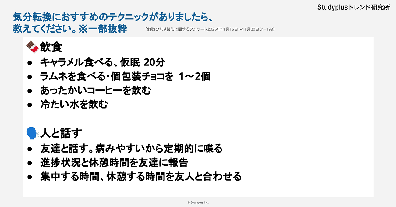 気分転換におすすめのテクニックを自由に答えてもらったところ、飲食や人と話すといった回答が寄せられた。