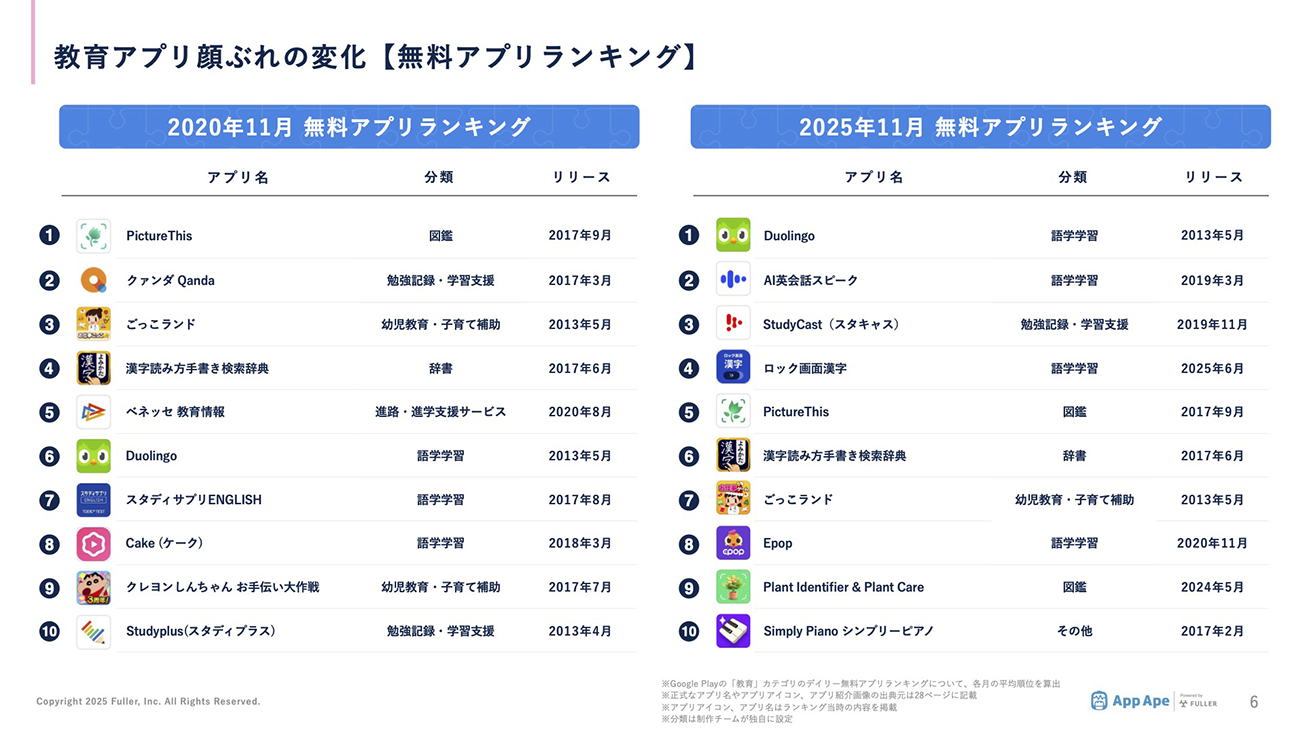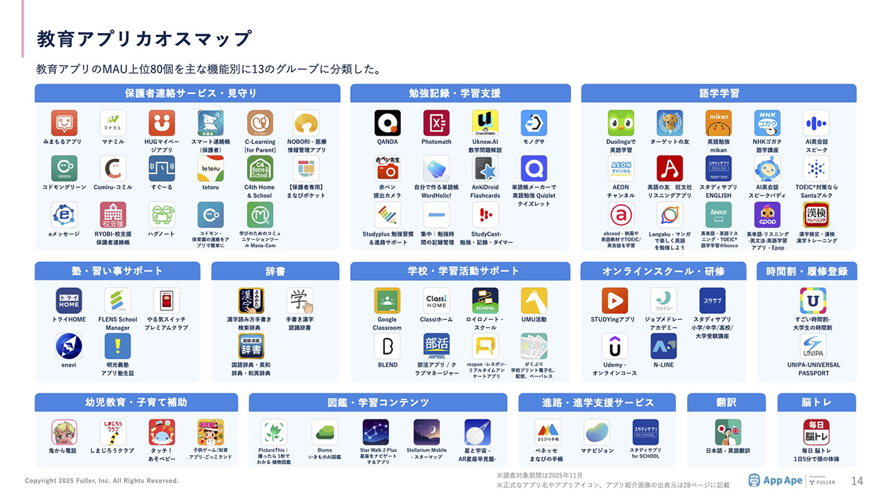 フラーは、同社の提供するアプリ市場分析サービス「App Ape(アップ・エイプ)」に蓄積されたデータをもとに、教育アプリの市場動向や利用実態をまとめた、「教育・学習アプリ市場調査レポート2025」を1月14日に公開した。