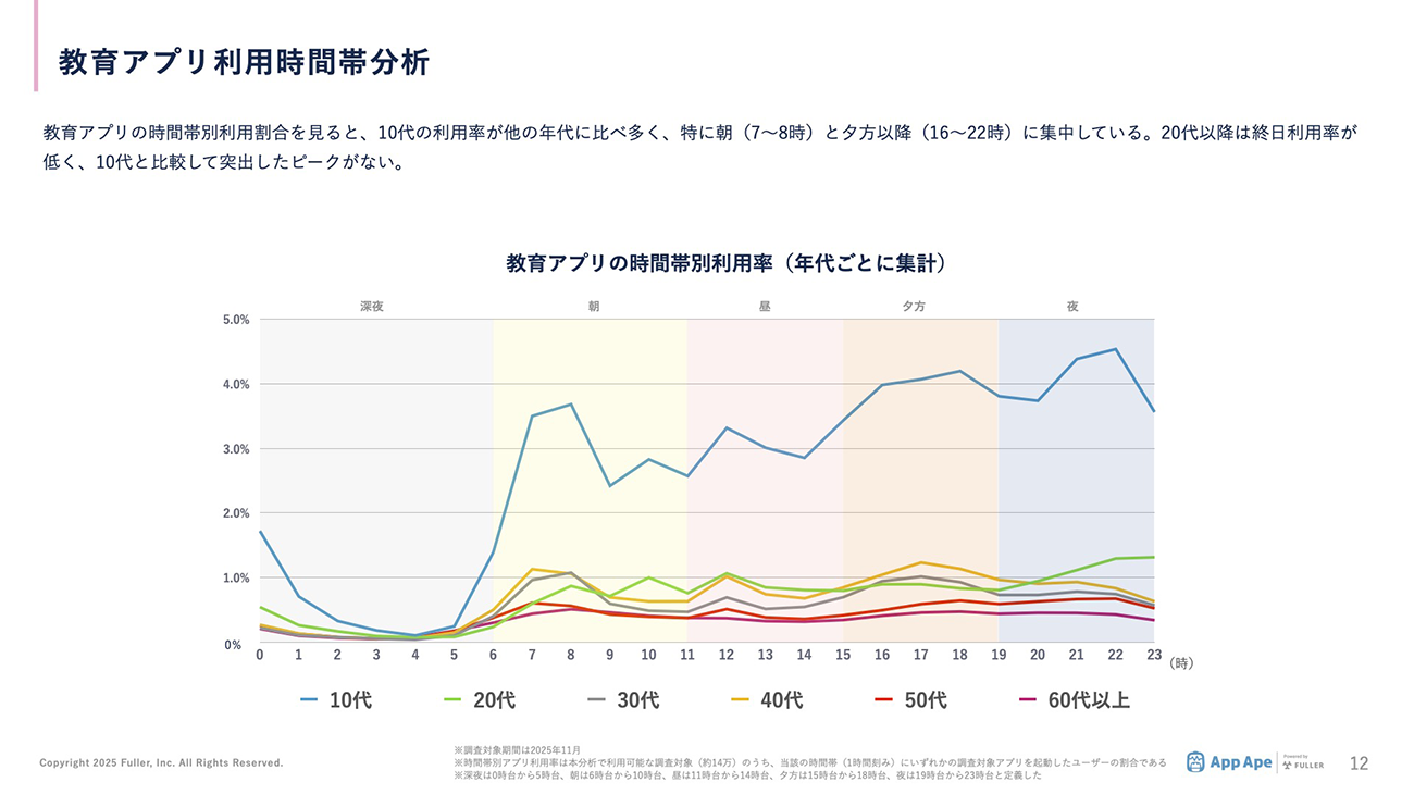 教育アプリを利用する時間帯は、10代では朝(7〜8時)と夕方以降(16〜22時)という、学校生活や家庭学習と連動した利用が多い。一方、20代以降では終日利用率が低く、10代と比較して突出したピークはない。