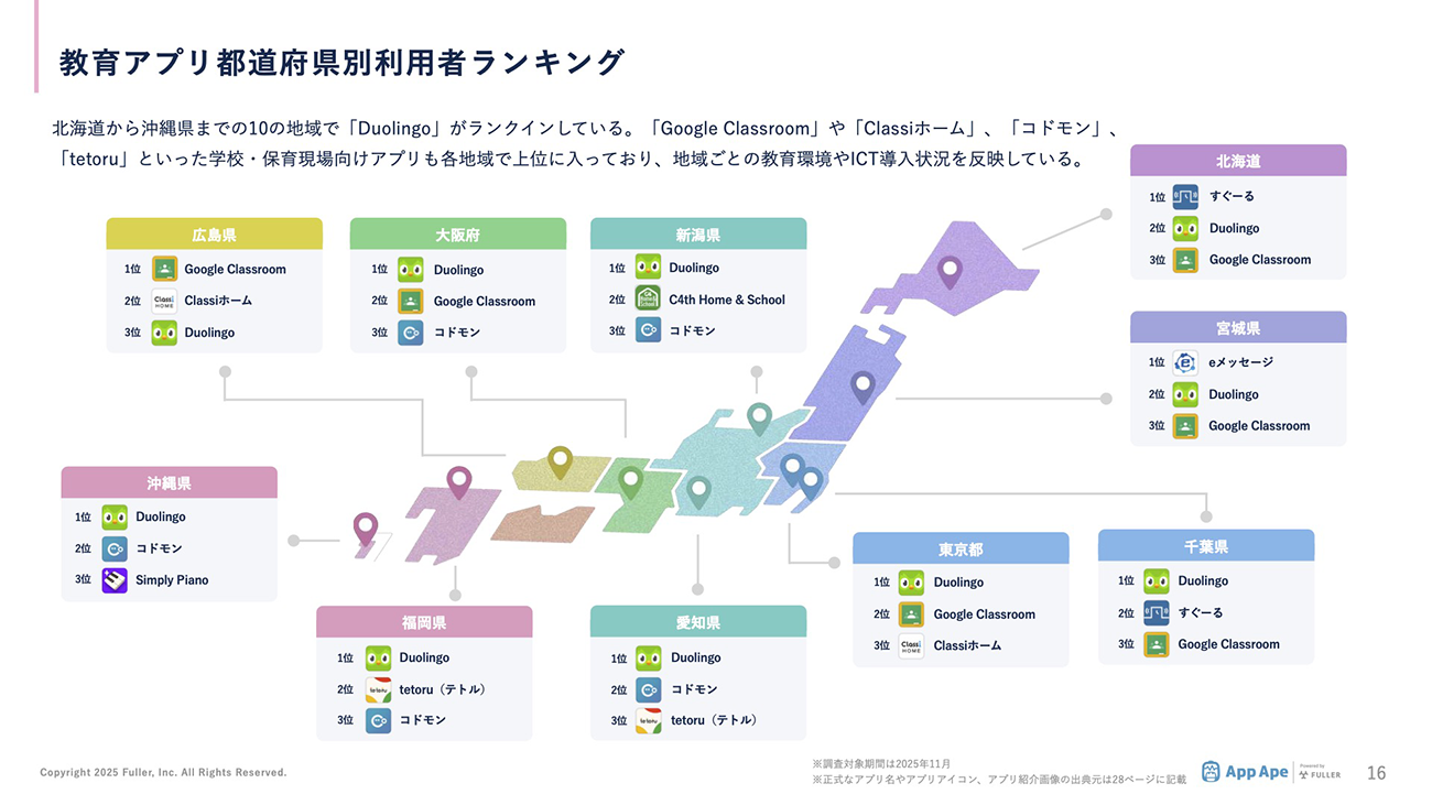 都道府県別に教育アプリ利用者ランキングをみると、多くの地域で「Duolingo」が上位にランクインしている。「Google Classroom」「Classiホーム」「コドモン」「tetoru」といった、学校・保育現場向けアプリも各地域で上位にランクインしており、地域ごとの教育環境やICT導入状況の違いが反映されている。