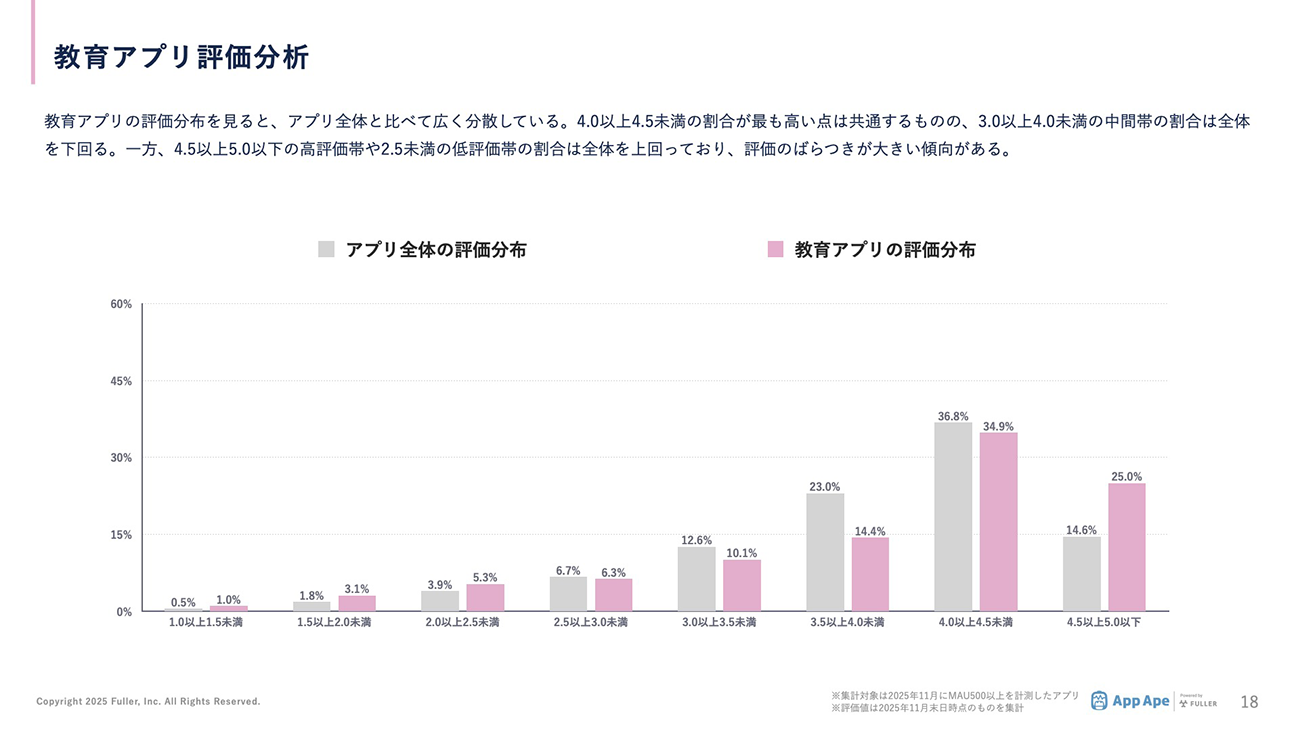 教育アプリの評価分布をみると、アプリ全体と比較して広く分散している。4.0以上4.5未満の割合がもっとも高い点は共通しているが、3.0以上4.0未満の中間帯の割合は全体を下回った。一方で、4.5以上5.0以下の高評価帯や2.5未満の低評価帯の割合は全体を上回り、評価のばらつきが大きい。