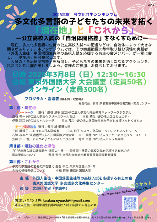 東京外国語大学の多言語多文化共生センターは、「外国人生徒・中国帰国生徒等の高校入試を応援する有志の会」との共催で、シンポジウム「多文化多言語の子どもたちの未来を拓く『現在地』と『これから』—公立高校入試の『自治体間格差』をなくすために—」を、3月8日の12時30分〜16時30分に東京外国語大学 本部管理棟(東京都府中市)2階の大会議室とオンラインのハイブリッド形式で開催する。参加には専用フォームからの申し込みが必要で、定員は会場が50名、オンラインが300名となっている。