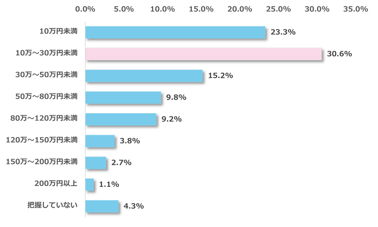調査対象者に、2025年にかかった子ども1人あたりの年間教育費(習い事やクラブ活動費を含む)の総額を尋ねたところ、「10万〜30万円未満」(30.6%)がもっとも多い。30万円未満が53.9%を占める一方で、30万円以上も41.8%に達している。