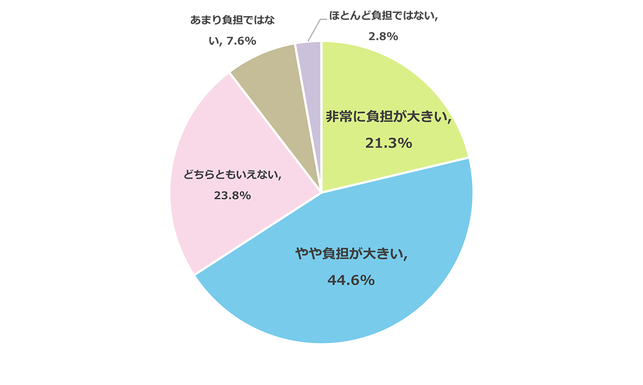 年間の教育費総額について、現在の家庭にとっての負担感を尋ねた質問では、「非常に負担が大きい」(21.3%)と「やや負担が大きい」(44.6%)を合わせた割合が65.9%を占めた。一方で、「どちらともいえない」は23.8%、「あまり負担ではない」と「ほとんど負担ではない」を合わせた割合は10.4%となっている。