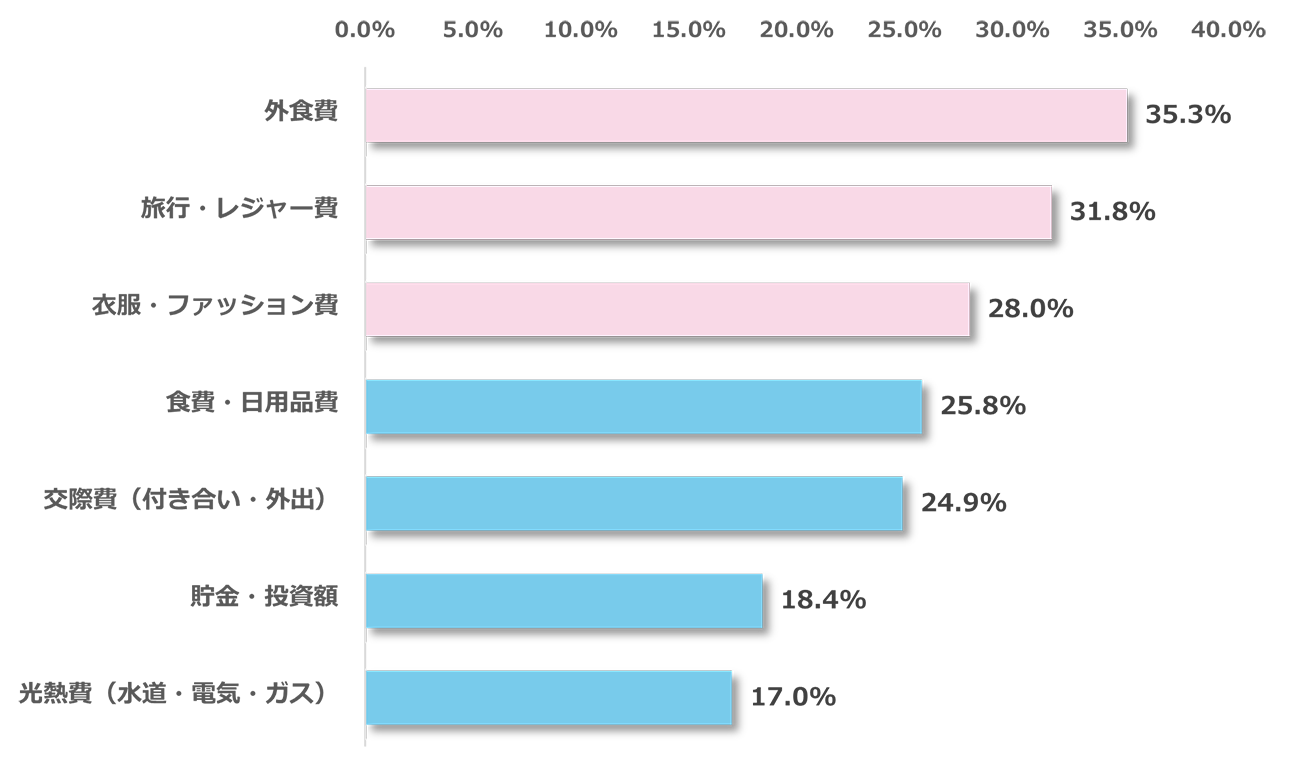 2025年に、学校外教育を含む教育費を増加・維持するために、家計の中で見直した支出としては(複数回答)、「外食費」(35.3%)が最多となっている。以下「旅行・レジャー費」(31.8%)、「衣服・ファッション費」(28.0%)が続いている。