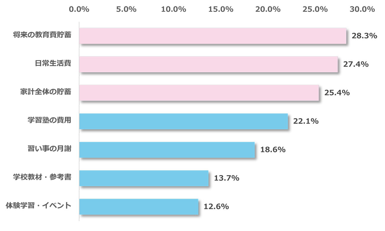 給食費無償化や教育費の負担軽減によって生じた余剰費用を、今後どのような用途に充てたいかという質問(複数回答)では、「将来の教育費貯蓄」(28.3%)がもっとも多い。「日常生活費」(27.4%)、「家計全体の貯蓄」(25.4%)がそれに続いた。