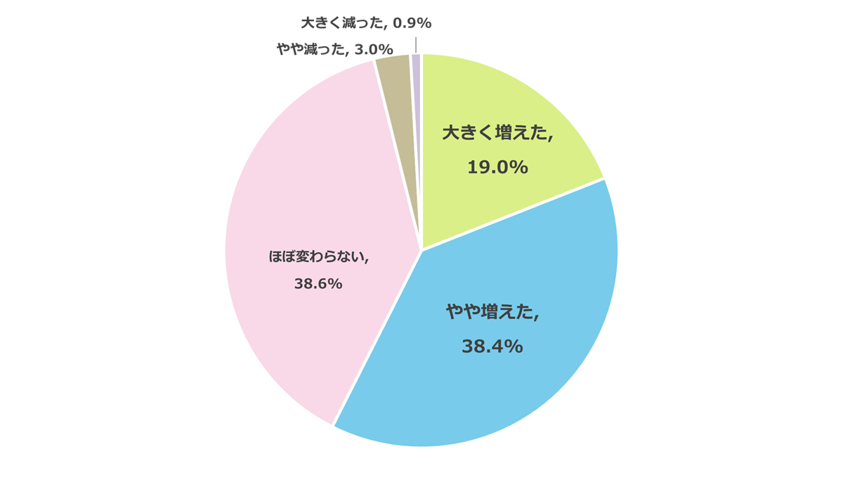 2024年にかかった年間教育費との比較については、「大きく増えた」が19.0%、「やや増えた」が38.4%となり、合計で57.4%が「増えた」と回答している。また、「ほぼ変わらない」という回答が38.6%となっている一方で、「大きく減った」(0.9%)と「やや減った」(3.0%)の合計は3.9%となっている。