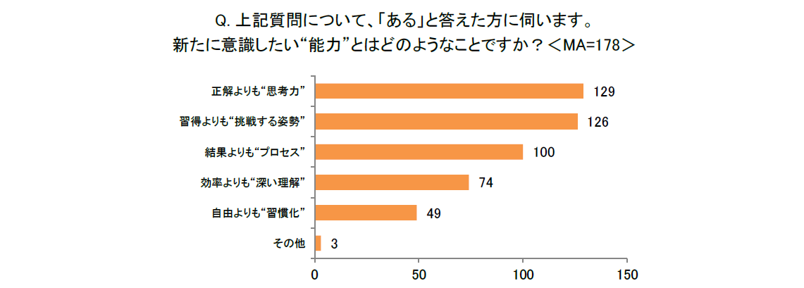 新年から、子どもに意識してほしい「学び」があるという人に、新たに意識したい「能力」について尋ねたところ(複数回答)、「正解よりも『思考力』」「習得よりも『挑戦する姿勢』」「結果よりも『プロセス』」が上位を占めた。