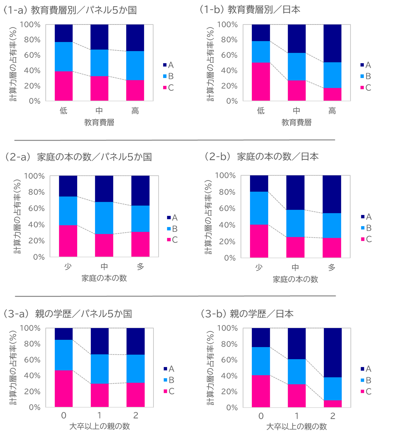 その結果、調査対象となったすべての国で、いずれの指標においても、低い/少ないほど計算力がC層(低め)の割合が高い、高い/多いほど計算力がA層(高め)の割合が高いという、典型的なSESの相関がみられた。