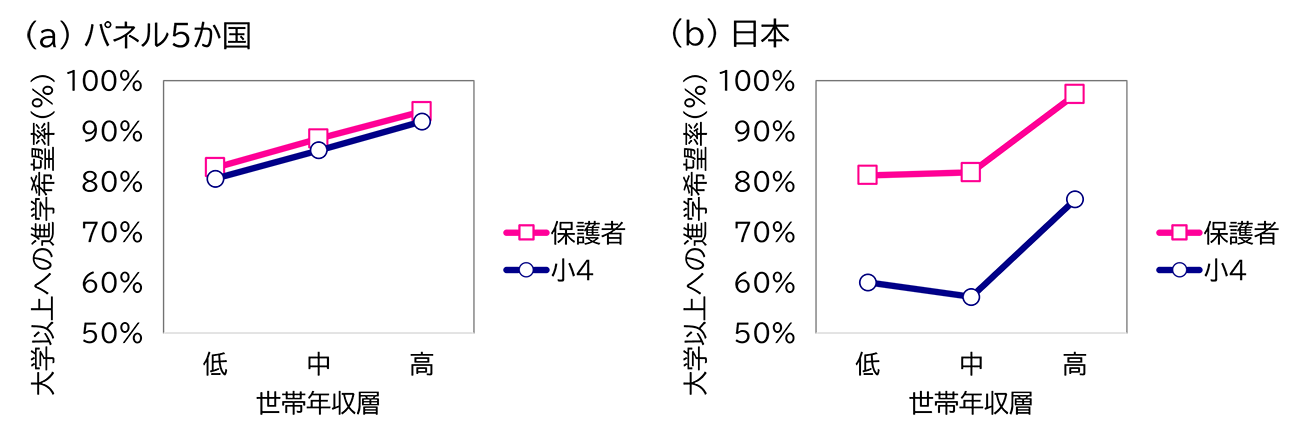 子ども自身(小学4年生)と保護者に対して、大学以上への進学希望と世帯年収の相関を分析した。その結果、いずれの国でも、子どもと保護者の両方で世帯年収が高いほど高い学歴を希望する傾向がみられた。