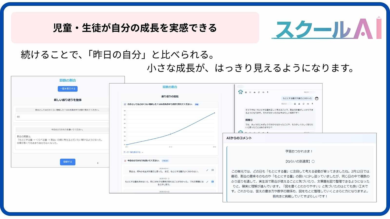 みんがくは、同社の提供する教育プラットフォーム「スクールAI」において、新機能となる「成長ジャーナル」を2月18日に公開した。同機能によって学びの振り返りを継続的に記録し、その変化を可視化できる。