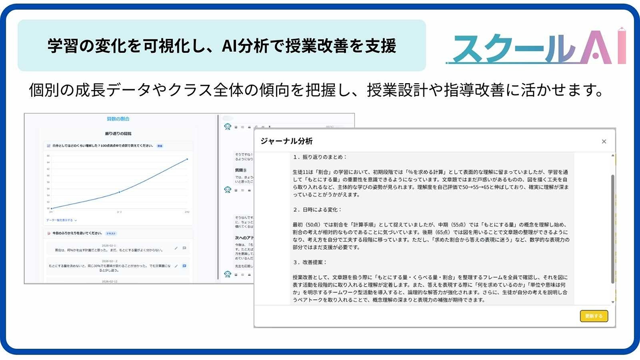生徒は、日々の学習やテスト、英会話練習や探究活動での挑戦を「自分専用の成長ノート」として気軽に記録する。「スクールAI」とのチャット内容もそのまま蓄積されるため、その時の思考過程や試行錯誤を振り返ることができる。さらに、ジャーナルに記録した内容に対しては、AIが具体的な成長ポイントや次の一歩を提示する。単なる提出物ではなく、「その時、何を考えていたか」を残せるようになっている。