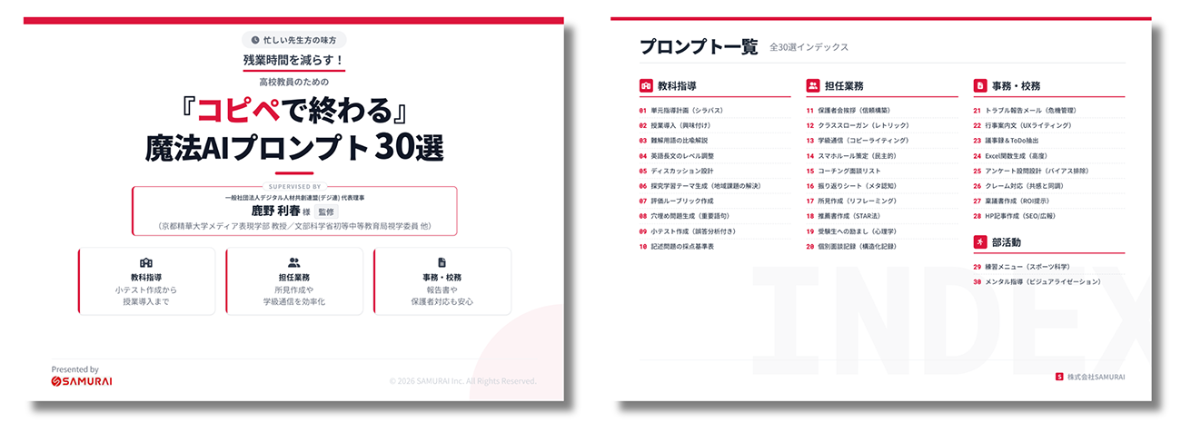 SAMURAIは、文部科学省の視学委員である鹿野利春氏が監修を担当した「校務DX魔法のプロンプト30選」を、2月18日に無償公開した。同ツールは、高校教員の業務をAIで効率化すべく提供された。提供方法は、所要時間1~2分のアンケートに回答した全員にダウンロードURLが送付される。