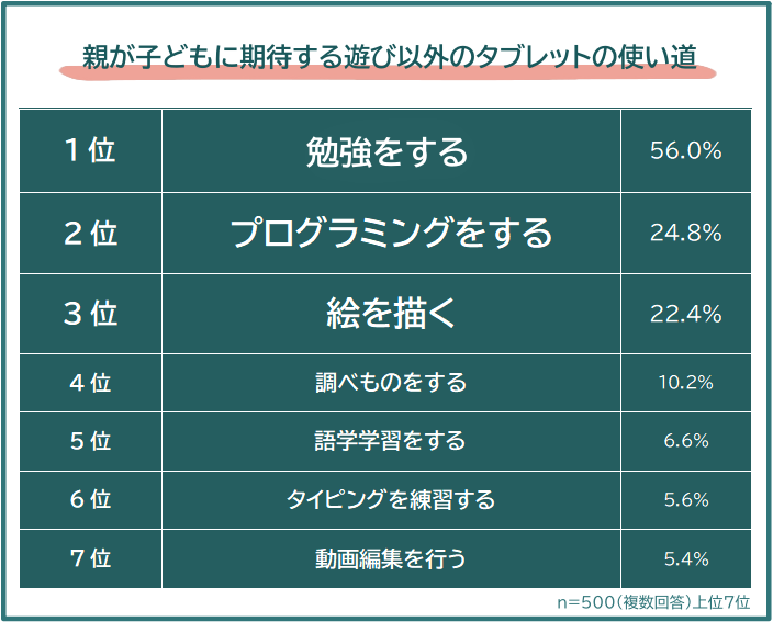 オンラインイラスト教室「アタムアカデミー」を運営するアタムは、「子どものタブレットの使い道に関する意識調査」の結果を2月20日に発表した。同調査は、小中学生の子どもを持つ保護者を対象に1月30日〜2月3日の期間に行われ、500名から有効回答を得ている。