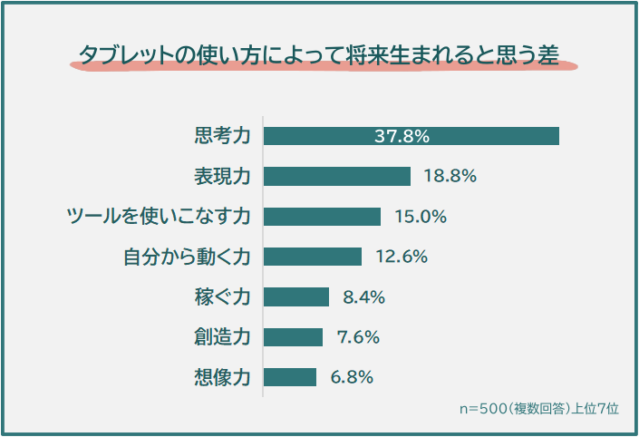 タブレット端末の使い方によって、将来どのような差が生まれると思うかを尋ねたところ(複数回答)、「思考力」(37.8%)がもっとも多い。「表現力」(18.8%)、「ツールを使いこなす力」(15.0%)、「自分から動く力」(12.6%)がそれに続いた。